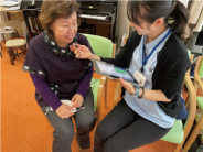 看護師が行う口の体操。口だけでなく、手も動かして脳も活性化☆また、6ヶ月に1回、看護師が口腔状態と栄養状態をチェック。 | |