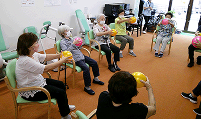 ボールやチューブなどを使用して皆で運動♪ 時には音楽に合わせ座ってできる エアロビクスも行います! |